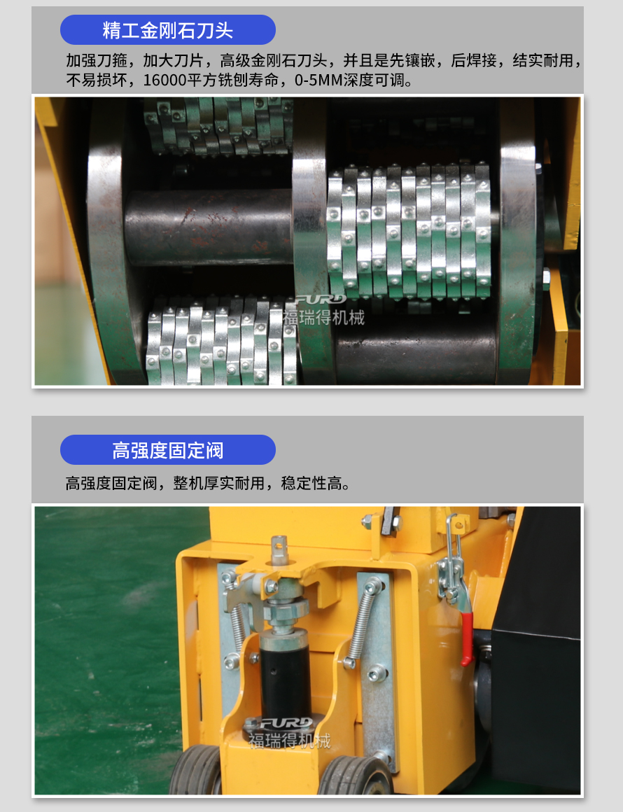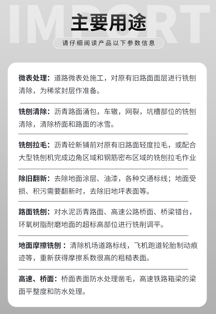 用于橋面鋪設(shè)瀝青或車間舊的混凝土地面重新攤鋪混凝土之前,清除水泥浮漿以及鏟平拉毛, 也用于清除建筑施工中的堅硬灰渣。